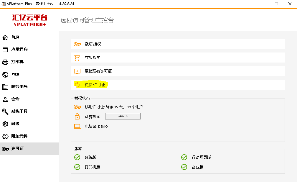 2. 在vPlatform+ 主界面上点击授权(Licensing)