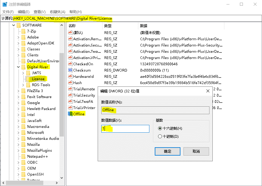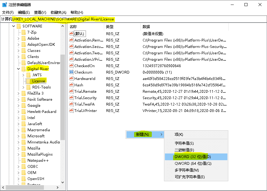 - 进入到以下位置:计算机\HKEY_LOCAL_MACHINE\SOFTWARE\Digital River\License,并添加一个DWORD(32)的项: