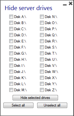 您可以通过AdminTool管理工具很容易的隐藏服务器的驱动器,防止用户通过”我的电脑”或者标准的”文件夹”对话框访问文件。点击AdminTool界面上的”Security 安全” 标签页,点击” 隐藏磁盘驱动器”: