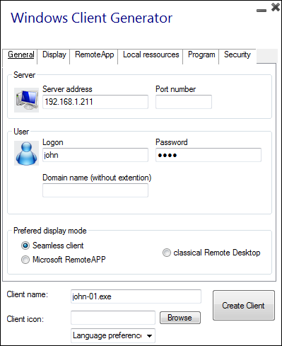 您可以通过HuiiRDP+客户端生成器来生成用户连接客户端配置,让用户通过所生成的客户端生来连接HuiiRDP+服务器。所生成的客户端员可以被复制到用户的桌面或者USB设备中方便的使用。如果您是第一次配置HuiiRDP+请确认相应的用户账号已经建立,如果HuiiRDP+服务器是加入域的,则确认在相应的Active Directory域中建立好相应的账号。