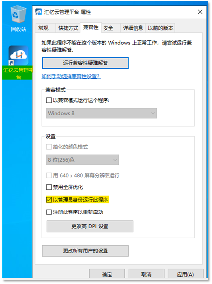 四、安装完成后,桌面上会多出一个汇亿云桌面的管理图标,右击-【属性】–【兼容性】设置以管理员身份运行,若未以管理员身份运行,在配置时会遇到错误
