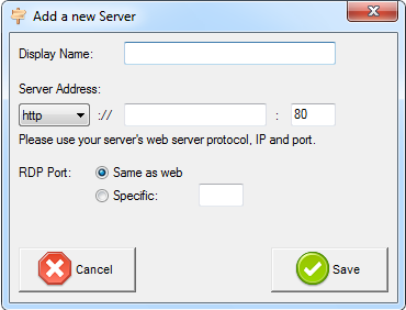 “Display Name”是服务器的显示名称,它会出现在有户登录Web 页面上,您可以取一个更方便用户理解并记忆的名称。当使用网关首页的负载均衡功能时,”RDP Port”将不被使用,它仅用于通过vPlatform+生成的客户端访问时使用,我们建议您保持默认的设置。