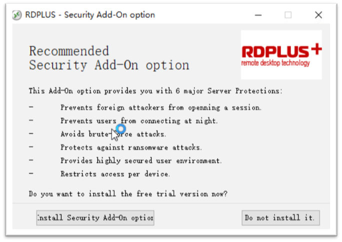 安装结束时会提示安装一个安全插件,如果您有更高的安全要求可以安装测试,比如只允许特定的设备才允许连接,同样是15天免费试用。可以暂时先不安装;