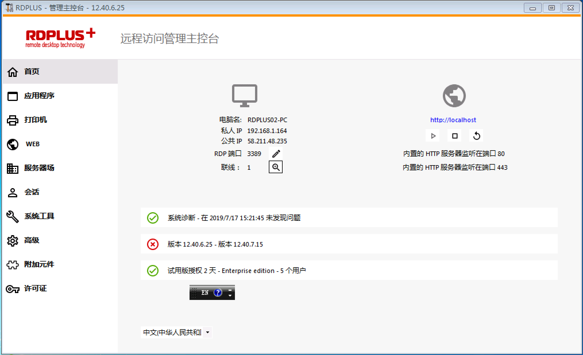 打开后就可以看到主控台了,该软件默认提供5并发用户15天的免费测试